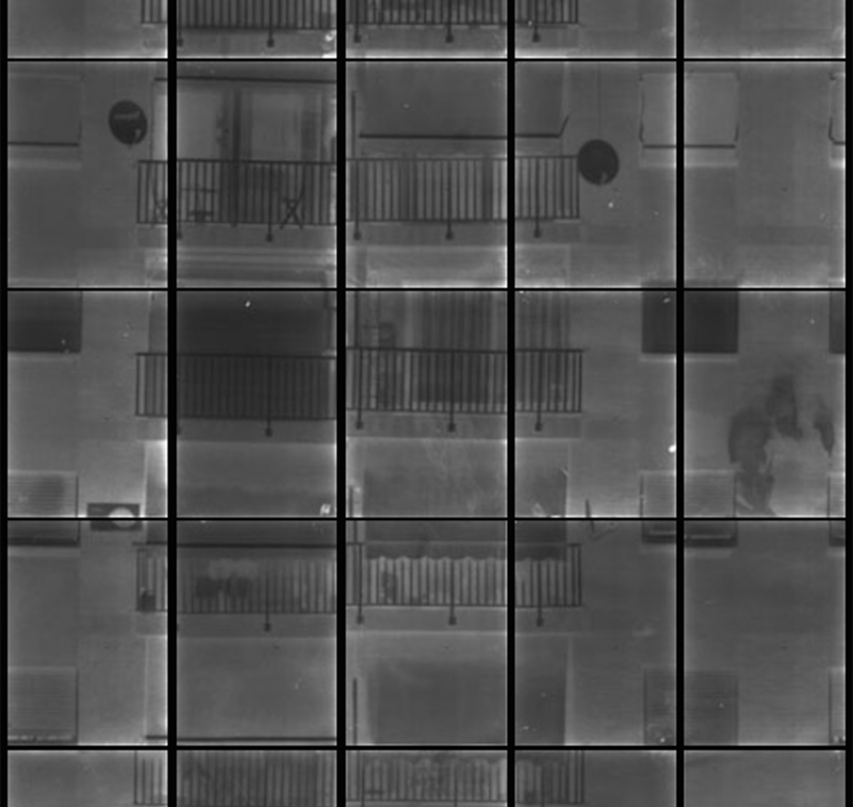 Cámara oscura realizada en mi habitación de Pujades 47. Fotos de la fachada de enfrente realizadas con papel fotográfico reciclado. Tiempo de exposición: 1h. Puede verse en positivo pasando el mouse por encima. IR a la página interactiva del proyecto.